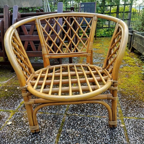 Hyväkuntoinen korituoli/rotinkituoli istuintyynyllä. Tyynyliinan pesu jää ostajalle. Istuinkorkeus on 40 cm + tyyny, noin 3 cm, ulkoleveys noin 70cm ja istuin levenee taaksepäin eli leveys etureunassa noin 58 ja takana noin 61 cm, syvyys noin 47cm, selkänojan korkeus lattiasta 88 cm.