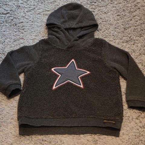 92/98cm paksu hupullinen collegehuppari teddyvuorilla, hihat ilma teddyvuorta, kokomerkintä 100cm mutta oli meillä käytössä 92/98 koossa