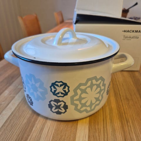 Myydään uusi pakkauksessa oleva Hackmanin emaloitu Talvikattila. Kattilan tilavuus on 3,9l. Kattila sopii kaikille liesille ja sen kuvion on suunnitellut Dog Design.