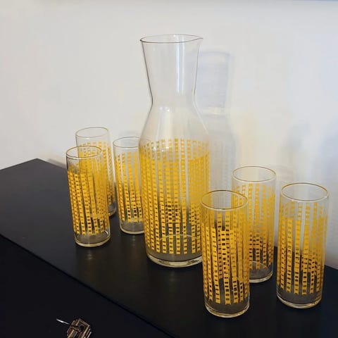 Hyvä kuntoiset 60-luvun Riihimäen Lasin kaadin ja lasit väriltään kirkas / valkoinen