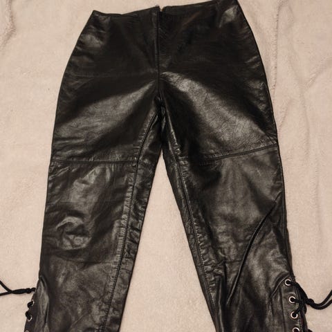 Tumman viininpunaiset HM- keinonahkahousut. Väri todella viininpunainen, vaikka kuvassa näyttää lähes mustalta. Leveä kuminauhavyötärö. Koko 38.