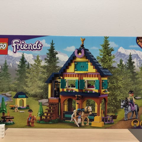 Lego 41683, Metsän ratsastuskoulu. Muutamia paloja puuttuu, osa korvattu toisilla. Kaikki hahmot ja hevoset. Ohjekirja.