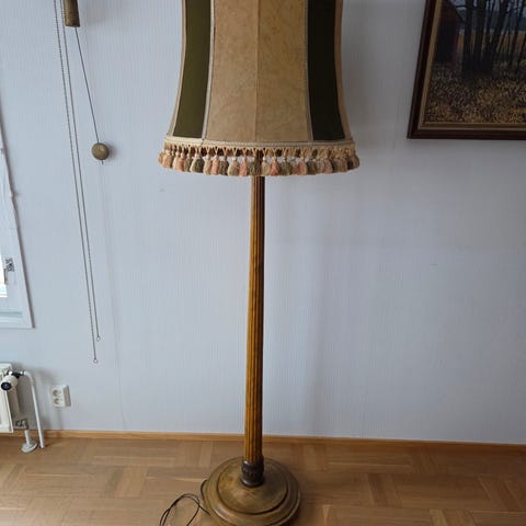 Myydään kuvan vanha vihreäsävyinen puinen jalkalampun jalka. Korkeus 128cm.
