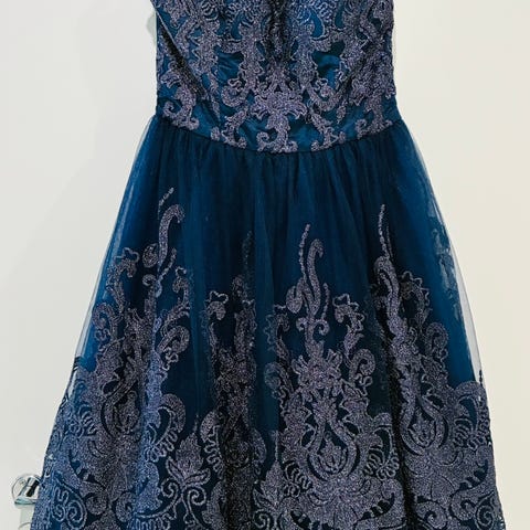 Punainen juhlamekko, sivussa vetoketju, takana yläosa pitsiä. Rintojen kohdalla toppaus. Vyötärö edestä n. 35 cm, olka-helma n. 102 cm. Kerran käytetty.