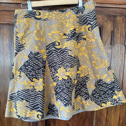 Napakkaa puuvillaa, sivutaskut. Takana vetoketju ja helmassa halkio. Vyötärö edestä n. 39 cm, vyötärö-helma n. 61 cm.