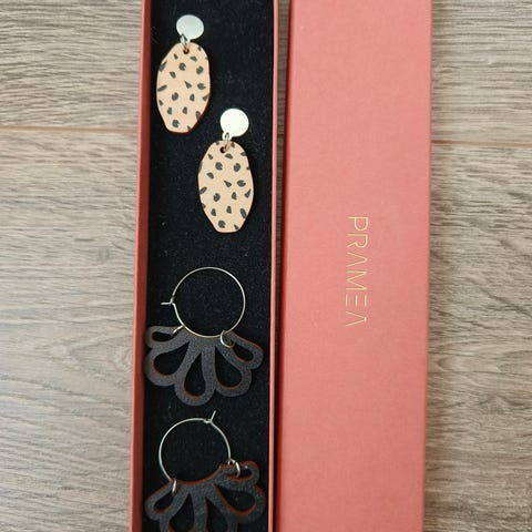 Pramea korvakorut, poronnahkaa, koivuvaneria, kirurgin terästä. Muutamia kertoja käytetty. Kaunis, metalli pinkki väri.