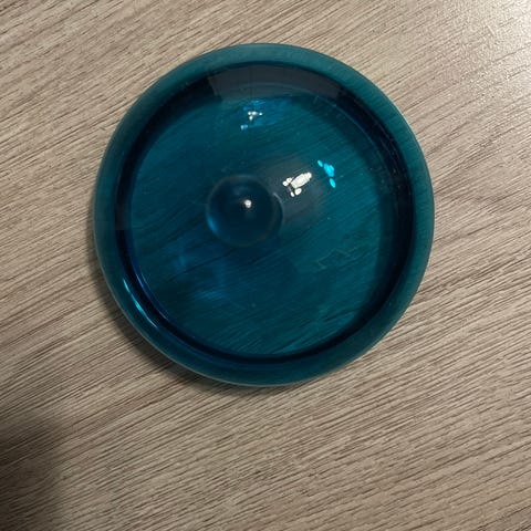 Ei ole virheetön. Kuvassakin näkyy yläreunan sisäpinnasta vasemmalta lohjennut lastu pois. Yläreunassa on lisäksi 2 pienempää jälkeä. No, hyvä puoli on että näyttävän kulhon saa halvalla, pienemmän kulhon hinnalla. Eikä tarvii pelätä vaan voi oikeasti laittaa käyttöön kuten kuuluukin. Useimmin tästä mallista näkee sen pienemmän 15/16,5cm koon kulhon, kun tämän korkeus on 19cm ja halkaisija ylhäältä 20 ja leveimmästä kohdasta noin 21cm. Sen verran ohutta lasia että tämä ei mitenkään houkuta pakkaamaan ja postittamaan. Nouto Kaarinasta.