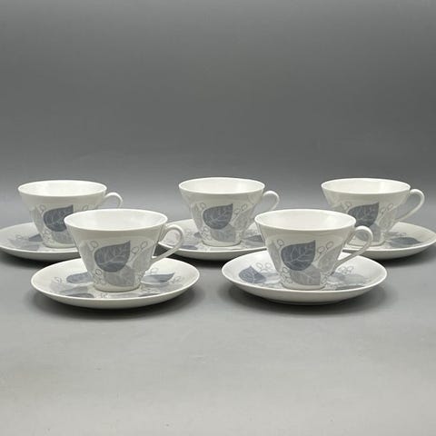 Vanhaa arabiaa, ohutreunainen posliinikuppi 4 kpl, asettilautanen 6 kpl, kakkulautanen 5 kpl, kermakko 1 kpl. Kaikki ehjiä ja vähänkäytettyjä. Myydään pakettina.