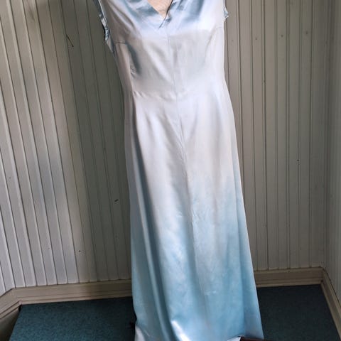 Upea naisten juhlaleninki. Suomessa valmistettu. Oikein tulee ikävä niitä aikoja, kun tekstiilejä vielä valmistettiin Suomessa ja tämä yksi esimerkki siitä. Pahoittelut huonoista kuvista, pyydettäessä parempia. Luonnossa vielä monin verroin kauniimpi kuin kuvissa. Kysele tarvittaessa mittoja varmistaaksesi sopivuus. Aika ihana vaikkapa erilaisiin juhliin. Postitus ok.