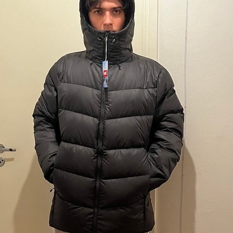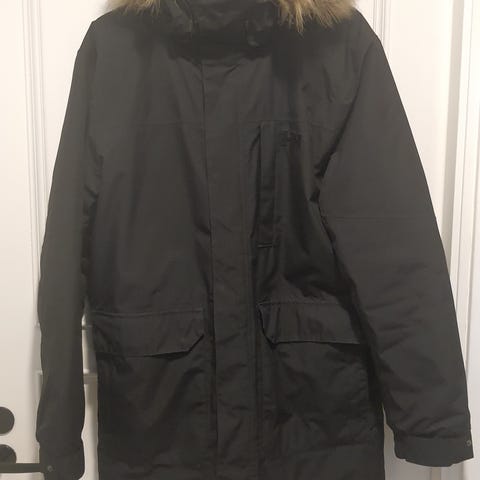 Hyväkuntoinen musta Helly Hansenin tuulen ja veden pitävä musta talvitakki jossa monta taskua ja selässä heijastin.