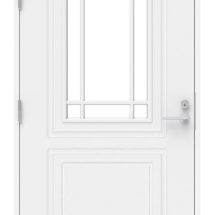 Väri valkoinen, leveys 1000 mm, korkeus karmeineen 1990 mm, karmisyvyys 170 mm, vasenkätinen , Abloy LC102-lukkorunko, ei avainpesää. Ovessa neljä vaakasuoraa ikkunaa.