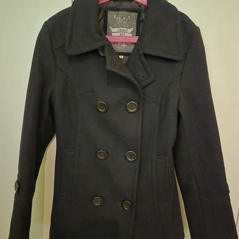 Kuvan mukainen KappAhlin tummanharmaa pitemmän mallinen villakangastakki, koko 146cm.