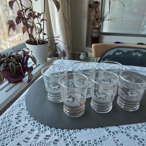 Kultakoristellut, aidot vanhat, lähes käyttämättömät Ravenhead juomalasit. 6 kpl. Koko n. 3dl. Virheettömät