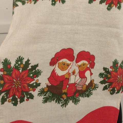 Valkoinen liina, sivuilla tontut touhuilee joulujuttuja. Keskellä on havuja ja sydämiä. On vanha, ei tarkempaa tietoa. Ei tietoa myöskään materiaalista. Ehkä puuvillaa..