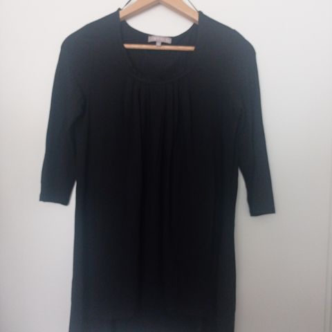 Myydään käytetty mutta edelleen käyttökuntoinen musta t-paita, koko S. Kultainen yksityiskohta kauluksella. Rypytys vyötäröllä. Ohutta materiaalia.
