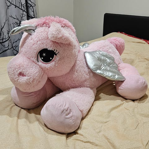 Siisti pehmo joka ollut nuorisolla, ei pienillä lapsilla. Nyt löydettiin kaapista ja siitä seuraavalle kiva halinalle. Pehmo kun istuu niin korkeus noin 80cm eli on iso.