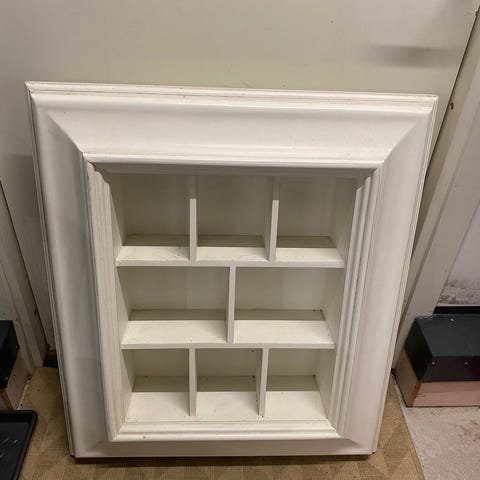 Kokopuinen eteisen hylly. Erittäin siisti. Hyllyssä oleva ovi ja laatikoiden vetokahvat ovat feikkejä: oikeasti ei ole kaapia eikä laatikoita. Pituus 82 cm, syvyys 36 cm ja korkeus 63 cm.