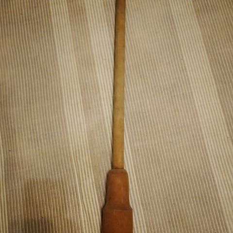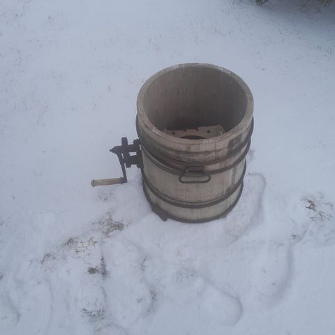 Vanha puinen pesukone koneen päällä on kampi, jolla voi liikuttaa edestakaisin koneen sisällä olevia kahta lapaa.