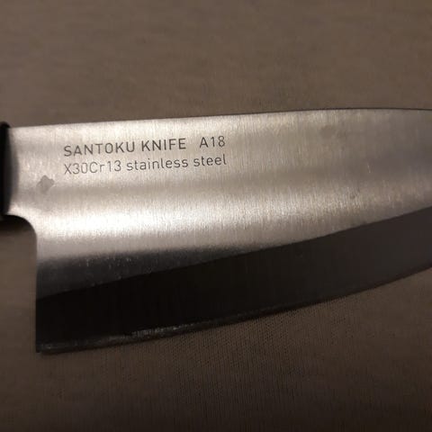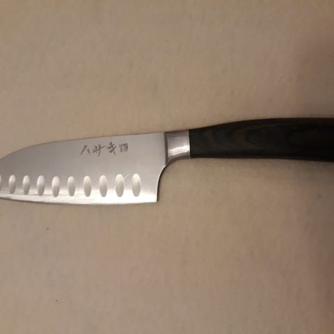 Veitsen terän sivussa erittäin pieniä, pesusta aiheutuneita kosmeettisia jälkiä, Terä täysin priima ja siinä on erittäin hyvä leikkausteho!