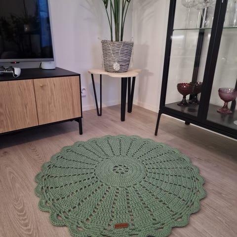 Kaksi harmaata virkattua pyöreää mattoa
