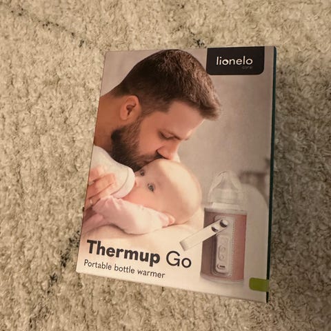 Maitopullon lämmitin. Tämän voi kytkeä vaikka varavirtalähteeseen joka on mukana ja lämmitellä maitoa sillä.
