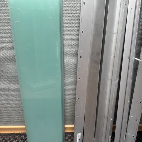 Lasihyllyjä 4 kpl, kiinnitys kahdella kromisella kiinnikkeellä. Hyllyn koko 26 x 10 x 0,6 cm