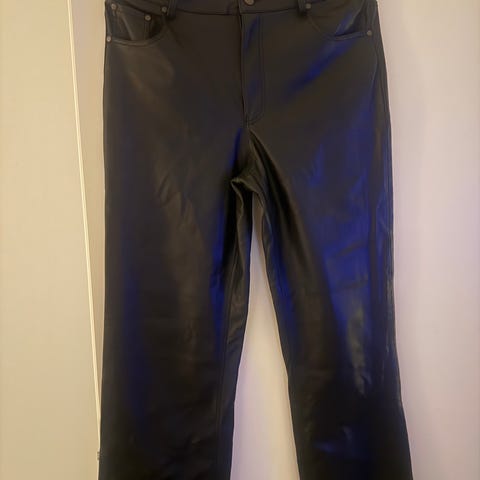 Zaran uudet tekonahkaiset housut, levenevät lahkeet. Koko l, lahkeen sisämitta 83cm ja vyötärönympärys noin 78cm.