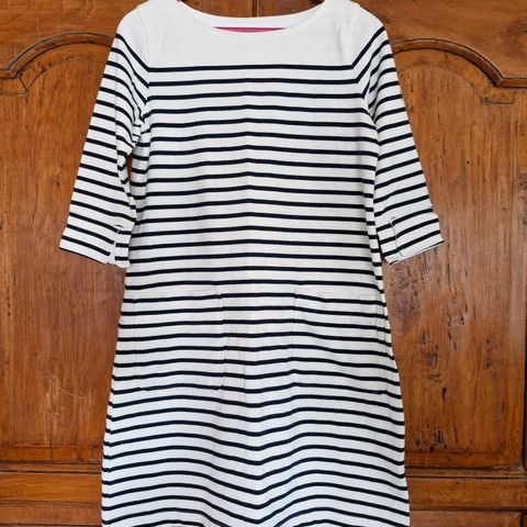 Laput paikoillaan, uusi klasikko laadukasta puuvillaa, Sini-valkoraidellinen merihenkinen mekko.