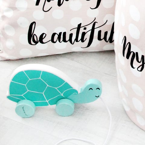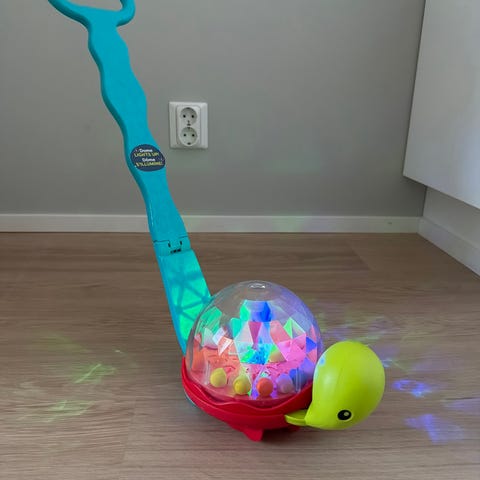 Muovinen vanha kilpikonnalelu. Sitä voi työntää alustalla, niin, että jalat liikkuvat ja pää kääntyilee samalla puolelta toiselle.