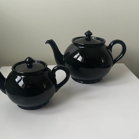 Teekannu, keramiikkaa. Rottinkinen sanka. Pannussa irrotettava teesihti. Kunto oikein hyvä, kansi moitteeton.