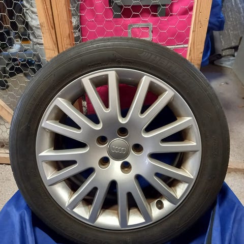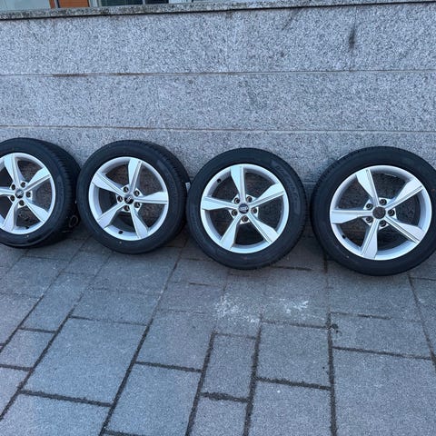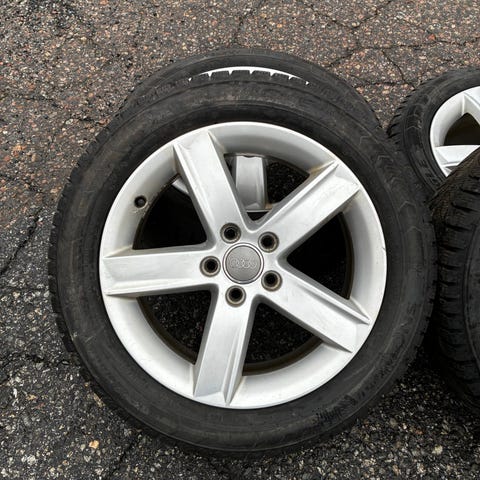 Audin alkuperäiset vanteet 17 tuumaa. Vanteet ovat hyvässä kunnossa kahdessa on tosi pientä kanttari jälkeä muuten suorat eikä tärisytä ja ilmat pysyy sisällä. Renkaat ovat 225/50/17 kahdet hyvät ja kahdet vähän huonommat.