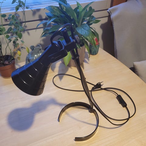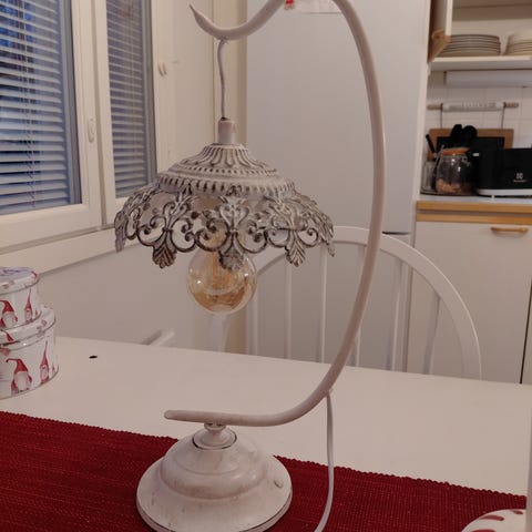 Pöytävalaisin/sisustusvalaisin, jossa valkea varjostin ja runko kromia. Korkeus 46 cm ja varjostimen alahalkaisija 20 cm. Johdon pituus 155 cm ja katkaisimen etäisyys valaisimesta 60 cm.