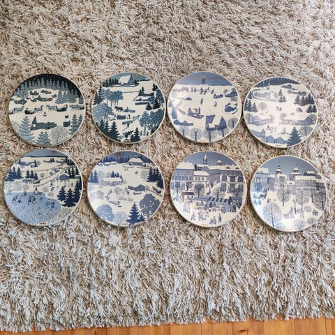 Myydään koko sarja Raija Uosikkisen kuvittamia Arabian joululautasia vuosilta 1978-1989. Uosikkisen jouluaiheisia lautasia valmistettiin yhteensä 12 vuoden ajan. Kauniita kultareunaisia lautasia kuvittaa talviset, tunnelmalliset maisemat ja tapahtumat sinisen sekä valkoisen sävyissä.
