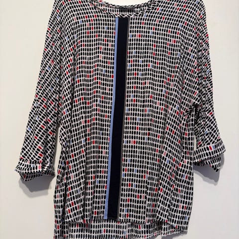 Käyttämätön, uudenveroinen Reflex-merkkinen pusero, koko XL. Hieman läpikuultavaa kangasta, jossa pinnalla pehmeitä/samettisia kohokuvioita. Kiiltävällä kanttinauhalla huoliteltu pyöreä pääntie. Kainalo-kainalomitta n. 54 cm, olka-helma n. 68 cm. Materiaali 80 % viskoosi & 20 % polyamidi.