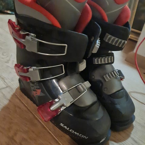 Salomonin laskettelumonot. Monojen kooksi arvioisin 34-35, koko lappu on kulunut pois, joten varmuutta koosta ei ole. Mono menee 36 jalkaan mutta on siihen liian pieni, joten todennäköisesti 34-35 kokoiselle sopivat. Monot ovat hyvässä kunnossa, vaikka pinnassa näkyy käytön jälkiä.