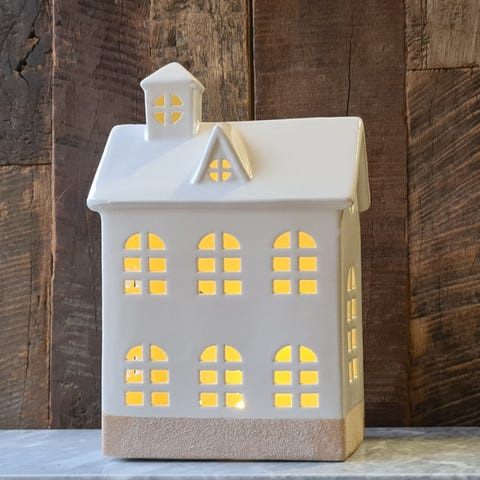 Myytävänä Amanda b'n vitivalkoinen keraaminen joulutalo led - valoilla.