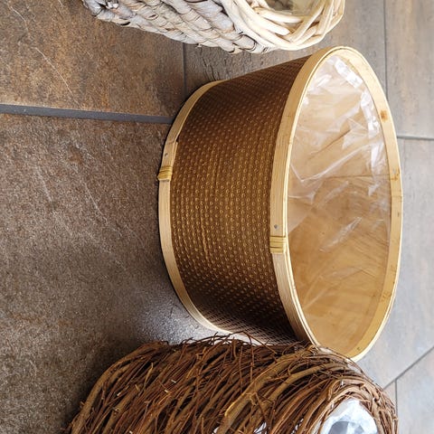 Ethän tingi kiitos. Mukaan vielä punainen keraaminen kukka/istutusastia. 16kpl kukkakoreja ja leipäkoreja, sisustus esineitä asetelmia varten. On metalli puu paju keramiikka muovi tuohi koreja. Samoin pääkuvan isompi pyöreä, aavistuksen vempula kori. Kyllä siinä vaikka lankoja pitää tai leluja. Kakkoskuvassa yhteiskuva koreista ilman pääkuvan koria ja kangaskoria. Muissa kuvissa lähikuvia koreista. Myydään settinä. Yksitellen 5-10 euroa kappale.
