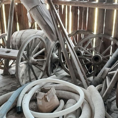 Kuvan kuntoiset markkinakärryt ja vara-akseli koristeeksi tai rekvisiitaksi.