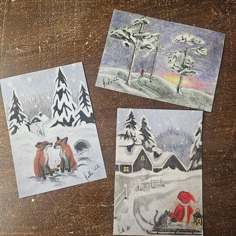 Myyn kolmea erilaista postikorttia, joissa on tekemäni digitaalinen maalaus. (EI tekoälyä!)