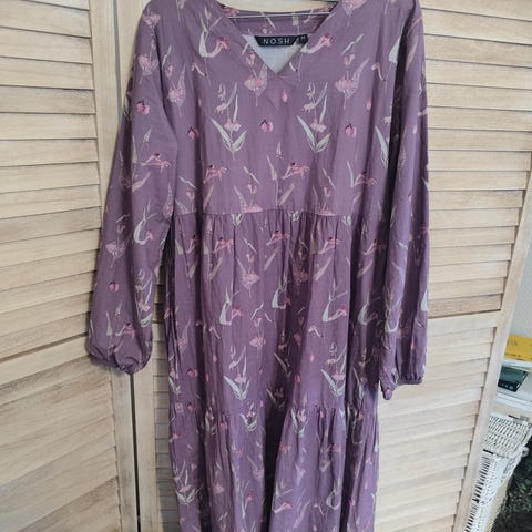 Nosh Tuike mekko koossa L. 100% puuvillaa. Kaunis väri joka parhaiten näkyy mallikuvassa. Vyön voi sitoa eteen tai taakse ja on kiinni sivuilta. Uusi, vain sovitettu. 30 € +pk. Kalajoen keskustassa. Voin postittaa. Kissatalous. Mmm.