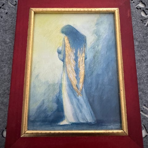 Kehyksen koko noin 29x34cm, kuvan koko noin 14,5x17,5cm. Taulussa tekstit " K.V. 3/9 " ja " Anelma Lahtinen 2008 ".
