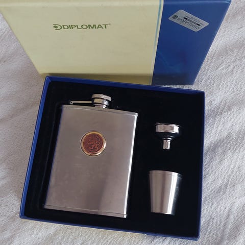 Setti, jossa nahkapäällysteinen terästaskumatti tinahirvellä, teleskooppikuppi ja tratti puulaatikossa. Hieno lahjaidea esimerkiksi hirvimiehelle!