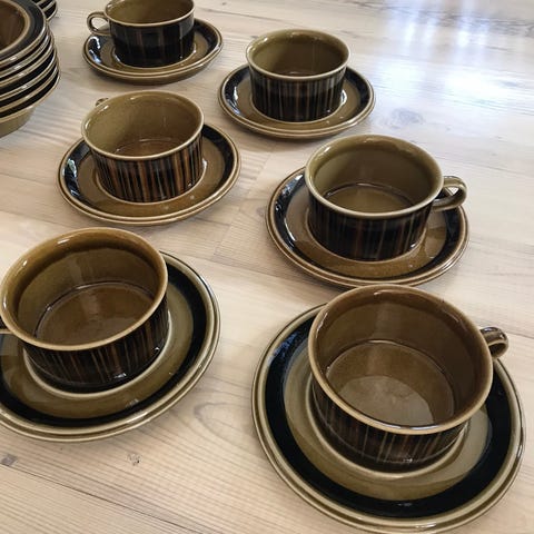 Ostan hyväkuntoisia sinisiä Kosmos teekupin asetteja, halkaisija noin 16cm. Noudan Turusta muuten postituksella