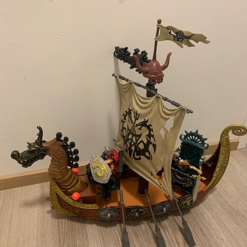 Hienoa viikinkilaiva, pohjassa pyörät. Kaksi figuuria ja ampumistoiminto.