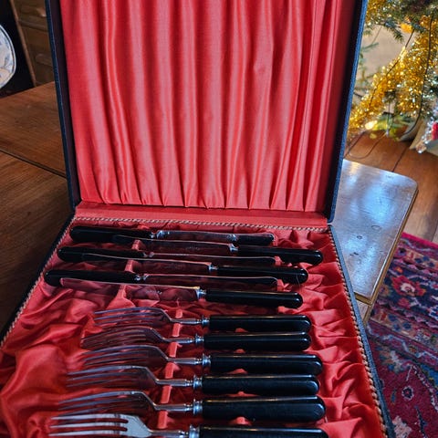Alkuperäislaatikossa 6+6 veitset ja haarukat olisko about 50-luku. Voi olla että ovat jopa käyttämättömiä.