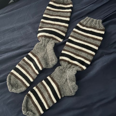 -Itse kudotut villasukat tumma marjapuuro/raita. Koko 38/39.