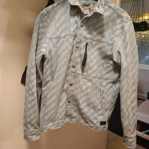 Myytävänä miesten farkkutakki, jossa edessä kaksi rinta- sekä sivutaskua, takin sisäpuolella yksi iso tasku.