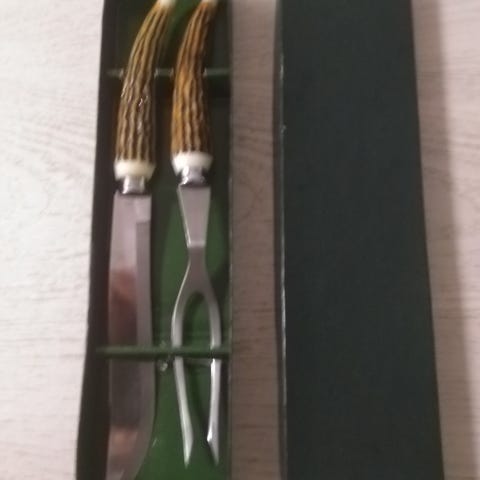 Kinkku/paistinveitsi ja -haarukka. Ruostumatonta terästä. Vähän käytetyt.