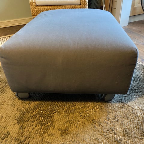 Harmaalla sametilla verhoiltu Hillsta rahi. Koristetikkaus antaa rahille yleellisen ilmeen.