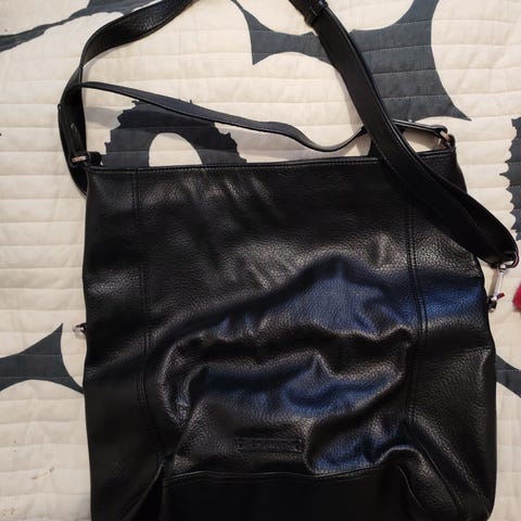 Tilava laukku olkahihnalla tai pitkällä hihnalla. "2kokoa " suurin 38×38×9ja levenee. Taitoksella 26×38×9. Väri musta harmaa. 2 sisätaskua. Laukussa vetskari ja tukevat hihnat